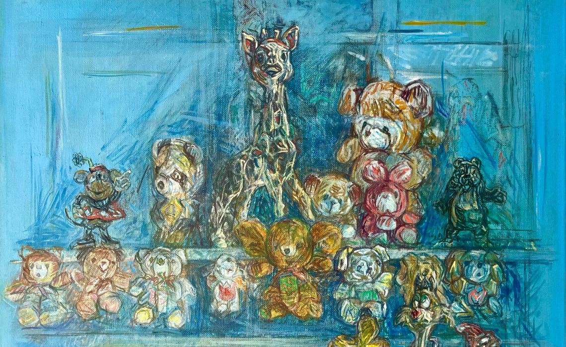 « L’atmosphère de quiétude hors du temps de la salle d’ornithologie du musée Labenche, jointe à l’attitude impassible des oiseaux exposés sous vitrine, m’ont paru réunir les conditions propices à commencer rapidement plusieurs esquisses, en tête-à-tête avec ces animaux ne bougeant pas d’une plume. Ces simples exercices pratiqués habituellement dans les musées par « hygiène et entretien » m’ont fait découvrir et observer un monde animalier que je connaissais mal, avec l’envie de poursuivre ce travail pendant ces trois dernières années à chaque séjour en Corrèze. Tirer parti de ces rapides notations, étalées à mon retour à l’atelier, s’est progressivement imposé, répondant au projet d’en développer une suite de peintures et dessins insistant sur le caractère expressif et pictural amorcé par les croquis, et de renouveler ainsi l’un de mes thèmes. Essayer de représenter la vivacité naturelle de ces animaux « naturalisés » entremêle de nostalgie l’illusion de les deviner encore vivants. Glisser un peu de légèreté en les faisant dialoguer avec quelques figurines ravivant les souvenirs d’enfance (me) permet d’imaginer, apercevoir parfois, dans leur regard fixe, un clin d’œil amusé et complice. » (Claude Cussinet)